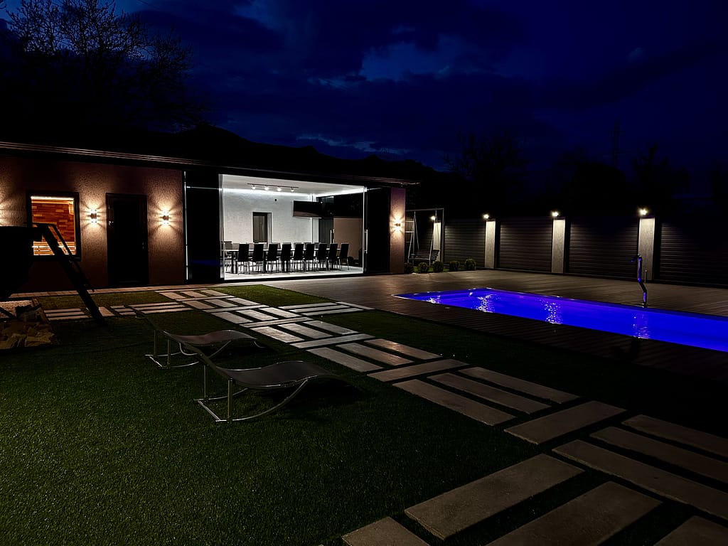 Данный проект был создан для предоставления услуг вне зависимости от погодных условии. Беседка на территории нашего объекта оборудована раздвижными панорамными дверями, теплым полом, кондиционером, что, в свою очередь, позволяет трансформировать ваш отдых в любую минуту!